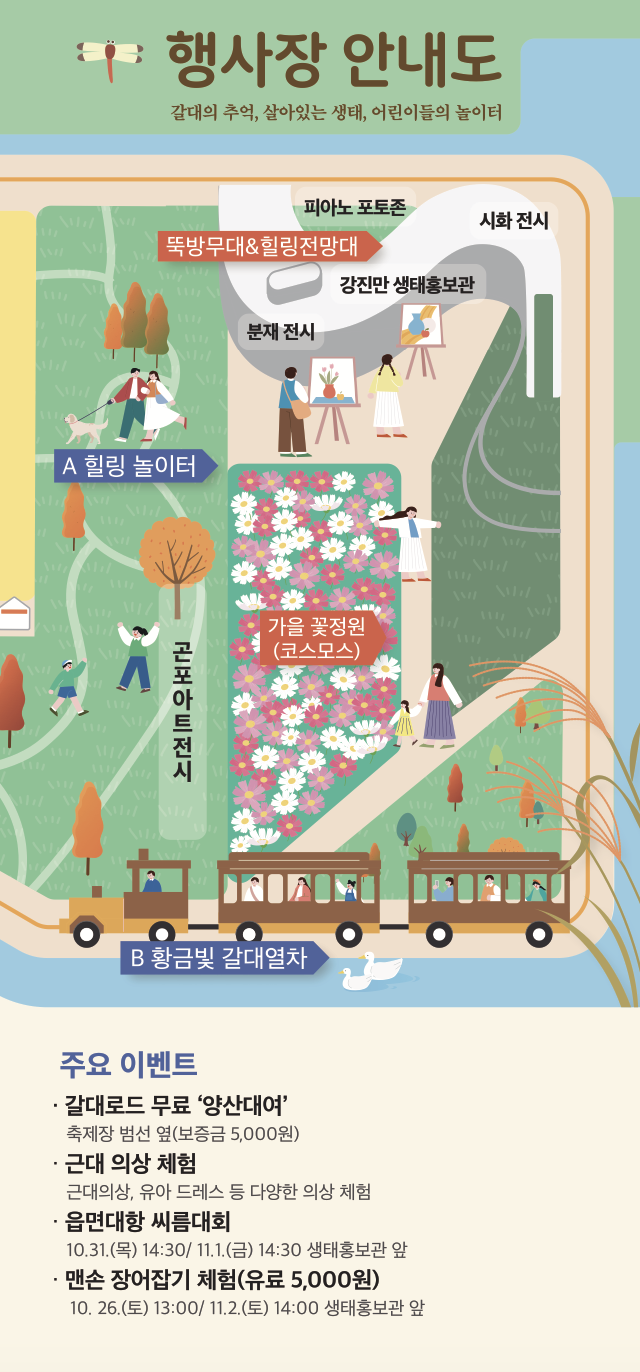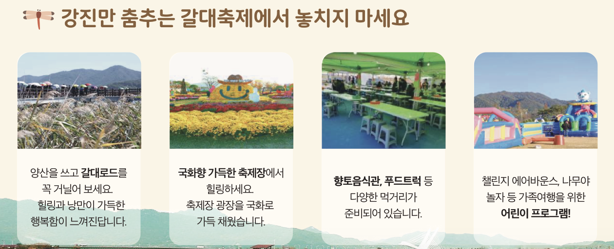 강진만 춤추는 갈대축제는 자연의 황금빛 갈대가 펼쳐진 광경과 다채로운 문화 프로그램이 조화를 이루는 가을의 대표 축제입니다. 이 축제는 강진만의 아름다움을 경험할 뿐만 아니라, 생태적 가치를 느끼고 지역 문화를 즐길 수 있는 좋은 기회입니다. 올해는 강진만에서 열리는 갈대축제에 방문해 가을의 낭만을 만끽해보세요.