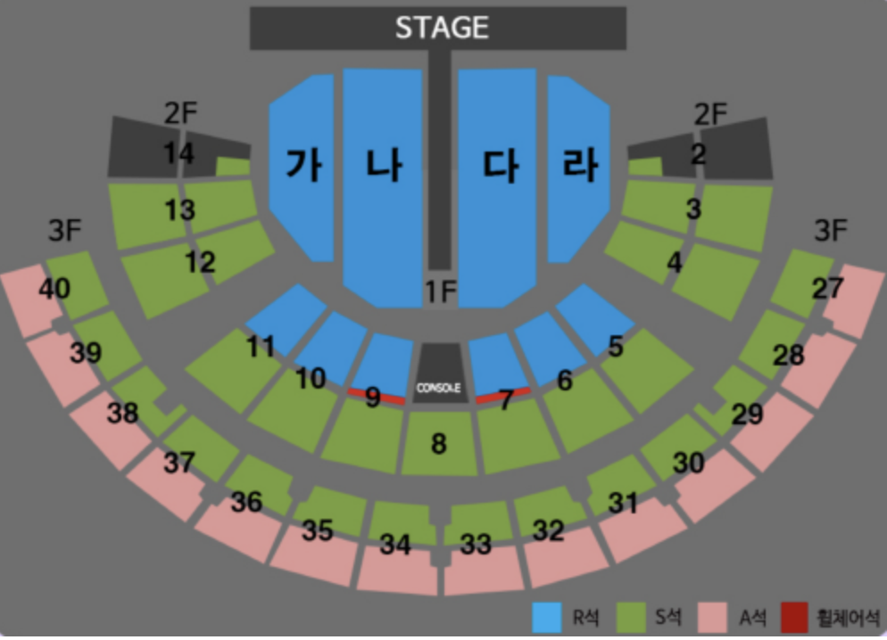 KSPO DOME의 좌석은 1층과 2층, 3층으로 나뉘며, 1층은 무대와 가까운 위치에 있어 가까이에서 공연을 감상할 수 있고, 2층과 3층은 위에서 무대를 내려다보는 형태로 조금 더 멀리서 넓게 공연을 볼 수 있습니다.